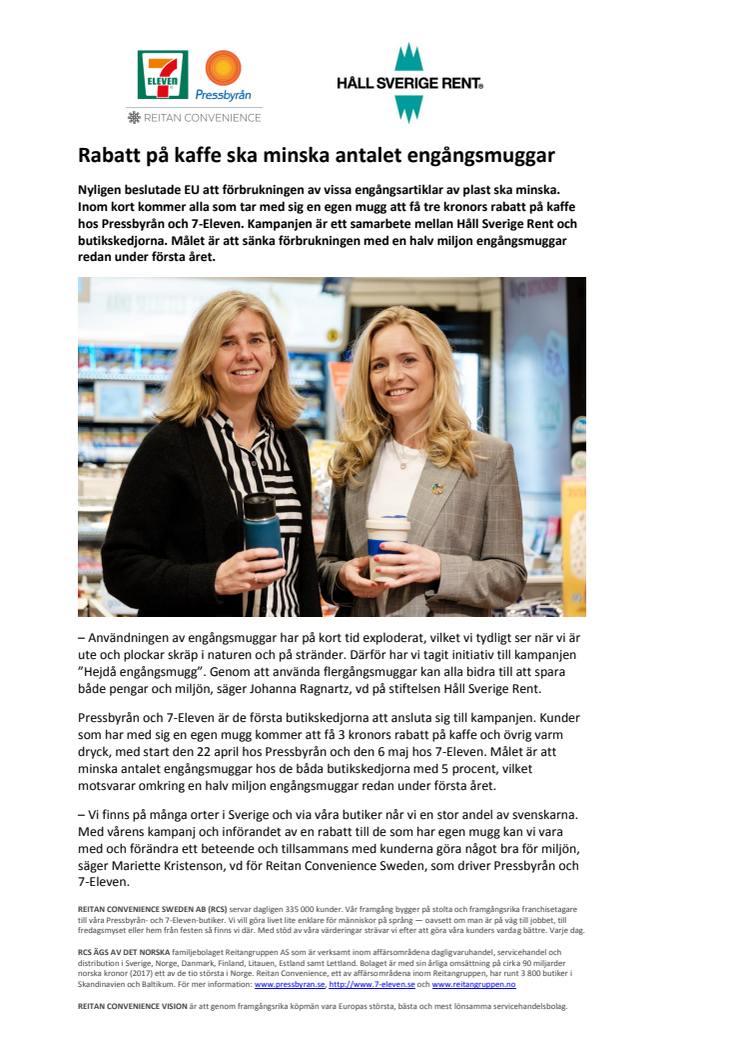 Nyligen beslutade EU att förbrukningen av vissa engångsartiklar av plast ska minska. Inom kort kommer alla som tar med sig en egen mugg att få tre kronors rabatt på kaffe hos Pressbyrån och 7-Eleven. Kampanjen är ett samarbete mellan Håll Sverige Rent och butikskedjorna. Målet är att sänka förbrukningen med en halv miljon engångsmuggar redan under första året.