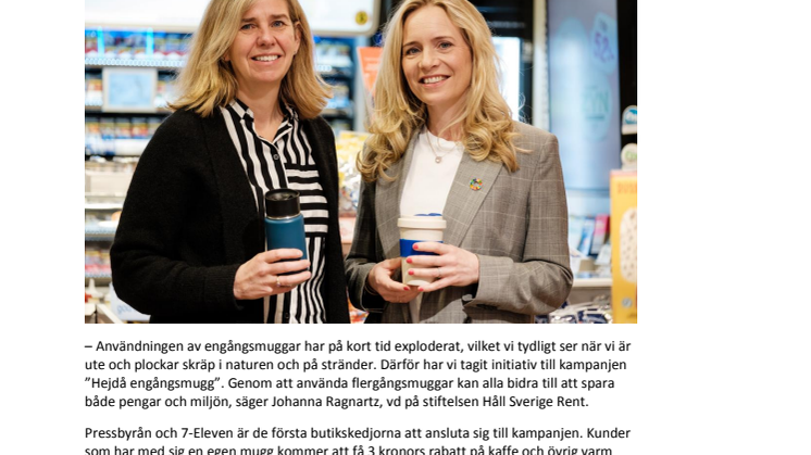 – Användningen av engångsmuggar har på kort tid exploderat, vilket vi tydligt ser när vi är ute och plockar skräp i naturen och på stränder. Därför har vi tagit initiativ till kampanjen ”Hejdå engångsmugg”. Genom att använda flergångsmuggar kan alla bidra till att spara både pengar och miljön, säger Johanna Ragnartz, vd på stiftelsen Håll Sverige Rent.