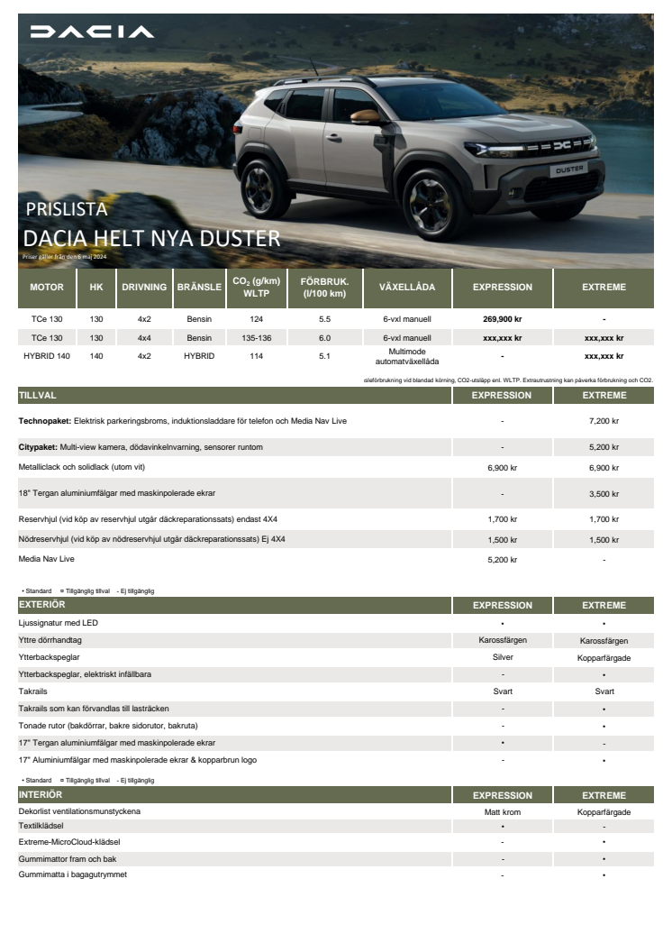Den nya Duster förväntas lanseras i Sverige till sommaren. Vi förväntar oss att ta hem Duster med - 130 hk TCe med 4X2 och 4X4 och Hybrid 140 4X2 automat samt i två versioner: Expression och Extreme.