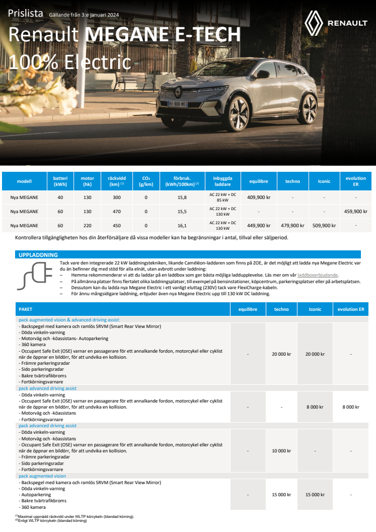 Från den 3 januari börjar priset för en Megane Electric på 409.900 kronor för versionen med 40 kWh batteri, 130 hk och 30 mil* räckvidd. För 40.000 kronor extra, alltså 449.900 kronor får konsumenten 60 kWh-versionen som ger 220 hk och en räckvidd på 45 mil*. Utrustningsversionen heter Equilibre och laddas med 22 kW AC och 130 kW DC-laddning. Som standard har den värmepump, trådlös mobilladdning, adaptiv farthållare, backkamera, två-zons klimatanläggning och mycket mer.