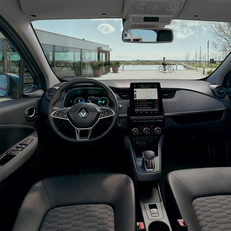 Nya ZOE är utrustad med ett 10” stort förarkluster redan från instegsversionen. Detta ger ZOE en funktionalitet och upplösning som är enastående i segmentet. Displayen visar de huvudsakliga förarstödsystemen samt samtliga inställningar som är direkt relaterade till körning på el som exempelvis ”Eco-metern” som uppmanar till eco-körning. Är bilen även utrustad med navigation visas GPS instruktioner direkt i förarklustret. Layout och belysning av förarklustret kan konfigureras av förare. De olika grafiska perspektiven som är valbara skapar en känsla av rymd och hjälper föraren fokusera. Den 9.3” stora pekskärmen sträcker sig längs mittkonsolen och ger tillgång till navigations- och underhållningstjänsterna. Pekskärmen styr bilens huvudsakliga inställningar som t.ex. förarstödssystemen och personifieringen av den 10” stora förarklustret.