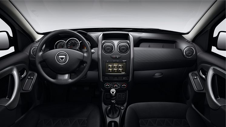 Duster kan även fås med multimedia- och navigationssystem via en 7” pekskärm på mittkonsolen. I systemet ingår Bluetooth Connectivity, 3D navigation och USB-ingång. Farthållare och backvarnare finns också som tillval. Förutom antisladdsystem (ESC) och elektronisk bromskraftsfördelning (EBD) har Duster förar- och passagerarairbag samt sidoairbag som skyddar huvud och bröstkorg. Baksätet har Isofix-fästen för enkel montering av barnstolar på de båda ytterplatserna.