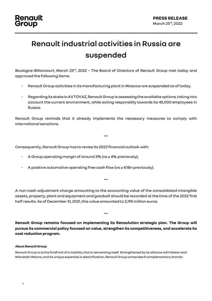 Renault Group påminner om att man redan genomfört nödvändiga åtgärder för att följa de internationella sanktionerna.