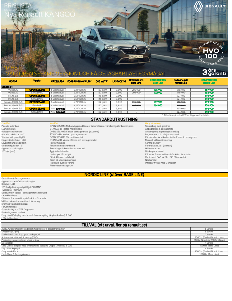 Nu startar försäljningen av Nya Renault Kangoo transportbil i svensk Renaulthandel. Modellen har förnyats och kommer med mer utrustning samt en stor innovation: Open Sesame (en sidoöppning med oslagbar lastförmåga). Pris från 164.900:-. Kangoo (personbil) fick 4 stjärnor i ett krocktest utfört av EuroNCAP tidigare i år varav flera säkerhetssystem också finns på transportbilsmodellen. En elektrifierad version av Kangoo lanseras under 2022, Kangoo E-TECH.