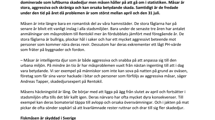 – Måsar är intelligenta djur som är både aggressiva och snabba på att anpassa sig till den urbana miljön. På mindre än tio år har måsproblemen vuxit från nästan ingenting till att i dag vara betydande. Vi ser exempel på människor som inte kan sova på natten på grund av oväsen, företag som får sina varor hackade i bitar och personer som förföljs av aggressiva måsar, säger Andreas Tapper, skadedjursexpert på Rentokil.