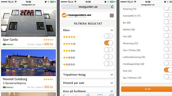 - När du söker hotell på Reseguiden.se i din mobil får du hotell och priser från ett 20-tal hotellsajter i en enda sökning. I mobilen har vi gjort stora hotellbilder i resultatlistan och det finns bildspel på varje hotellsida. Det är också enkelt att hitta hotell baserat på läge då du enkelt kan skifta mellan karta och lista.