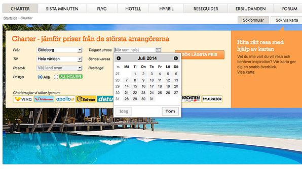 Vi har nyligen uppdaterat vårt chartersök så att du kan söka efter charterresor på exakt avresedatum. Du kan välja tidigast och senast utresa och på så sätt få de resorna som matchar. För dig som är flexibel finns också möjligheten att exempelvis välja en destination, utelämna datum, och på så sätt få reda på när det är mest prisvärt att åka dit.