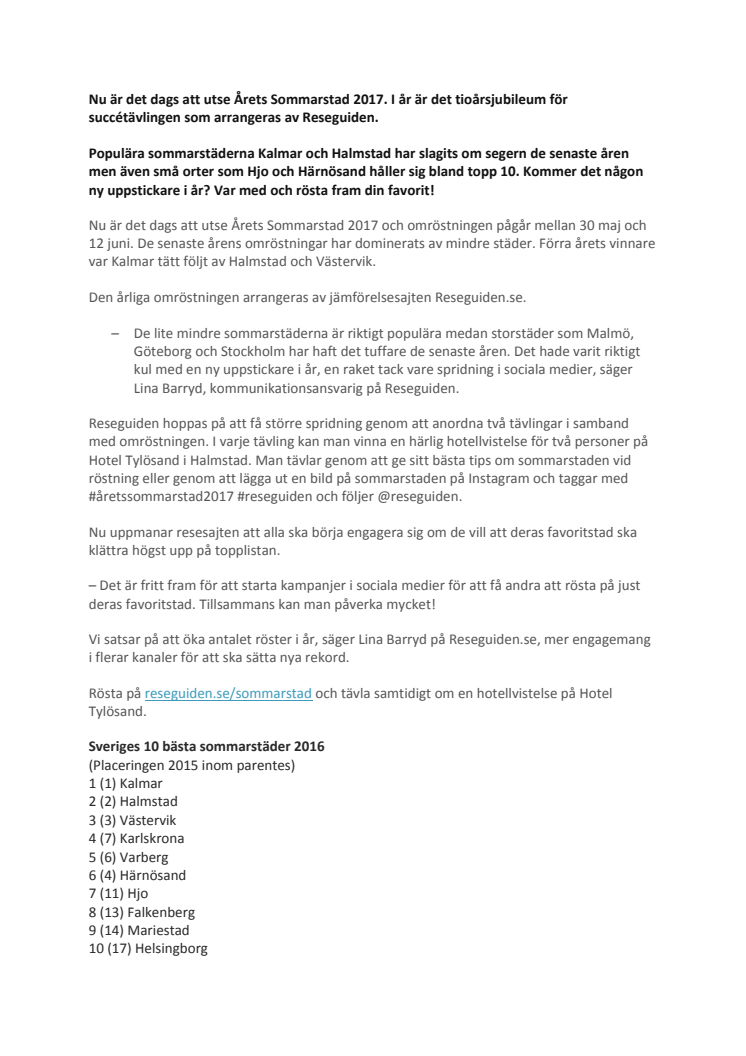 Nu är det dags att utse Årets Sommarstad 2017. I år är det tioårsjubileum för succétävlingen som arrangeras av Reseguiden. Populära sommarstäderna Kalmar och Halmstad har slagits om segern de senaste åren men även små orter som Hjo och Härnösand håller sig bland topp 10. Kommer det någon ny uppstickare i år? Var med och rösta fram din favorit!