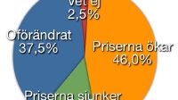 Lite mer än en tredjedel av de tillfrågade, 37 %, menar att priserna kommer att stanna ungefär där de är nu. Bara var sjunde, 14 %, tror att priserna kommer att bli lägre.