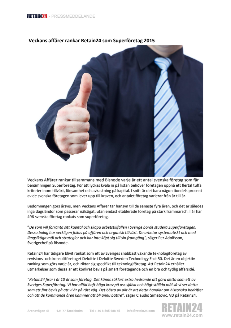 Veckans affärer rankar Retain24 som Superföretag 2015