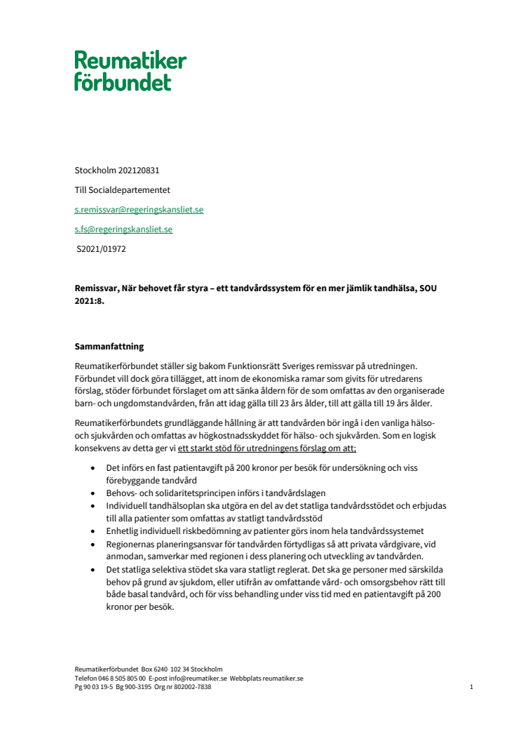 Reumatikerförbundets remissvar på utredningen för en mer jämlik tandvård, SOU 2021:8