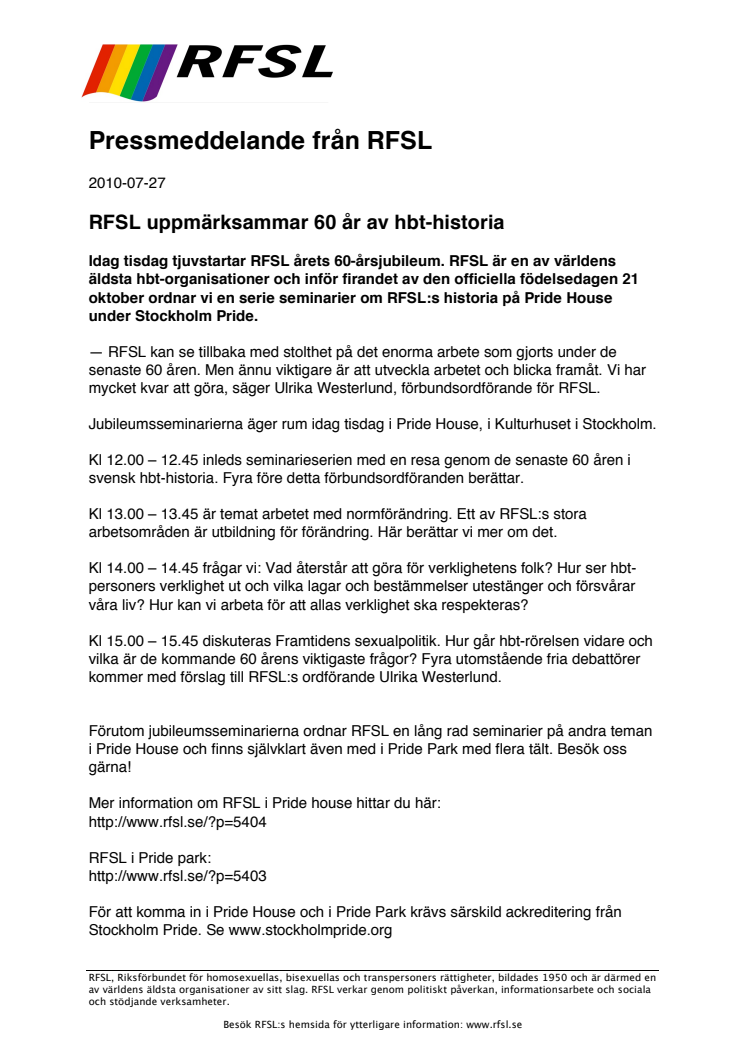 Idag tisdag tjuvstartar RFSL årets 60-årsjubileum. RFSL är en av världens äldsta hbt-organisationer och inför firandet av den officiella födelsedagen 21 oktober ordnar vi en serie seminarier om RFSL:s historia på Pride House under Stockholm Pride.