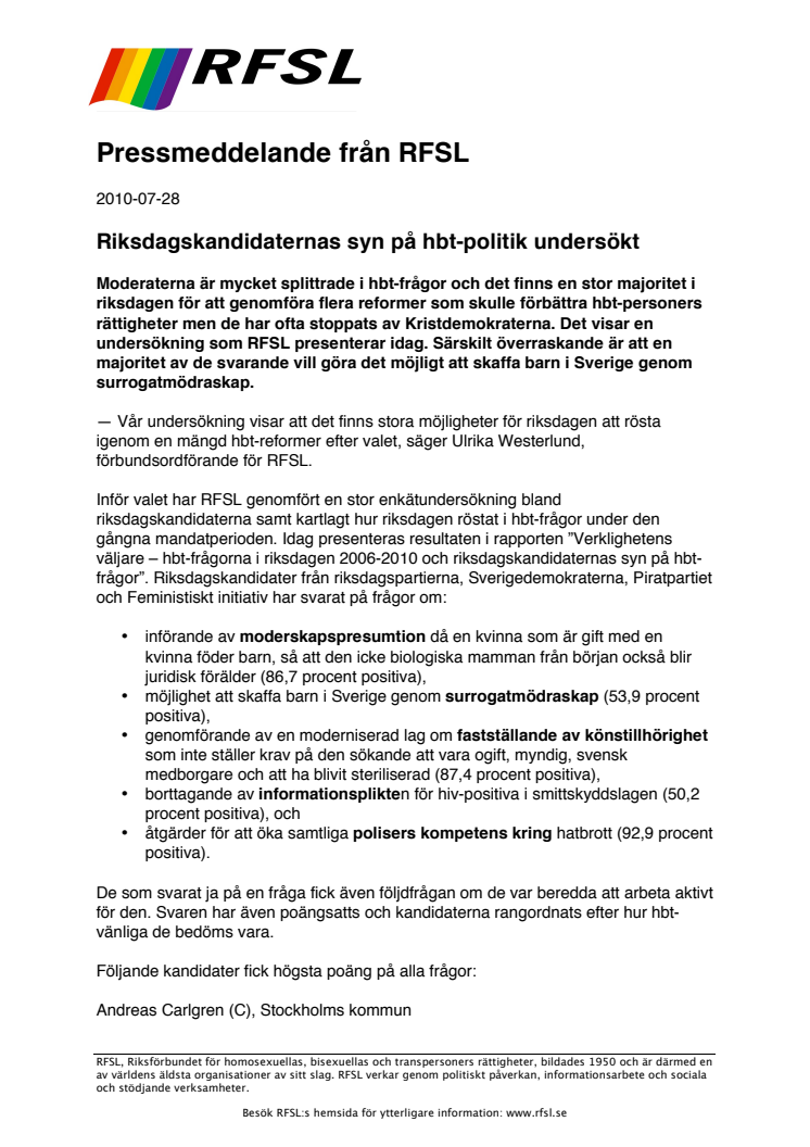 Moderaterna är splittrade i hbt-frågor och det finns en stor majoritet i riksdagen för att genomföra flera reformer som skulle förbättra hbt-personers rättigheter men de har ofta stoppats av Kristdemokraterna. Det visar en undersökning som RFSL presenterar idag. Särskilt överraskande är att en majoritet av de svarande vill göra det möjligt att skaffa barn i Sverige genom surrogatmödraskap.