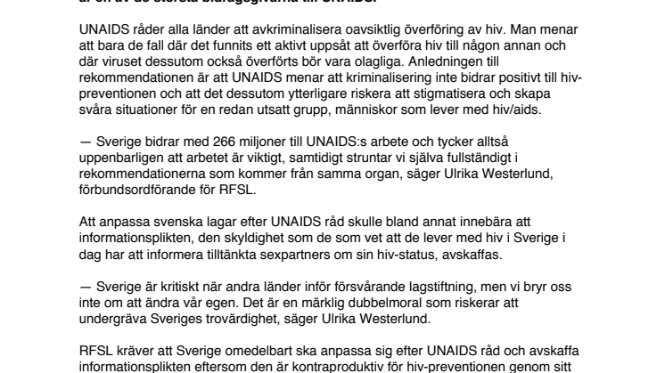 — Sverige bidrar med 266 miljoner till UNAIDS:s arbete och tycker alltså uppenbarligen att arbetet är viktigt, samtidigt struntar vi själva fullständigt i rekommendationerna som kommer från samma organ, säger Ulrika Westerlund, förbundsordförande för RFSL.
