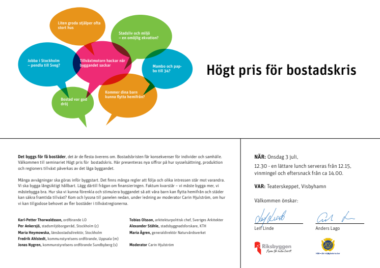 Inbjudan seminarium "Högt pris för bostadskris" 3 juli i Almedalen