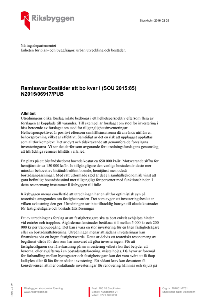 Remissvar ”Bostäder att bo kvar i (SOU 2015:85)”
