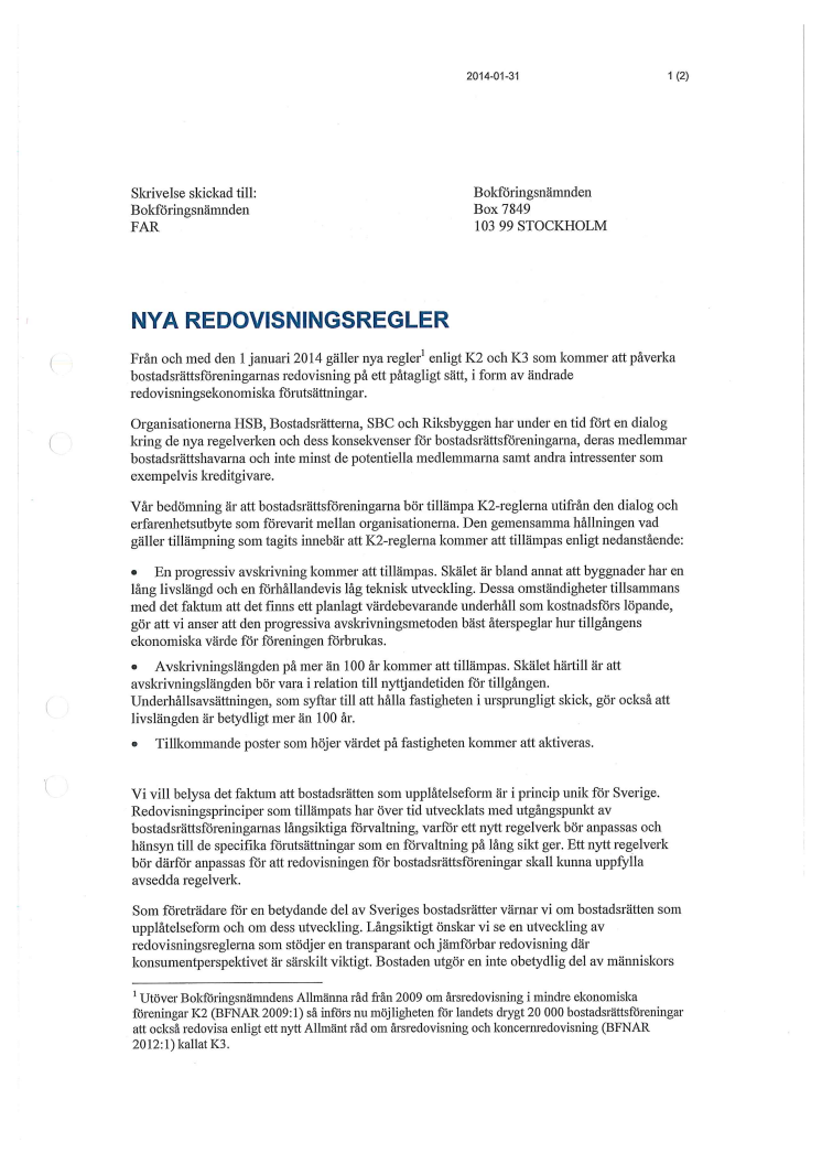 Med anledning av den nya tolkningen av avskrivningsreglerna för bostadsrättsföreningar, har Riksbyggen tillsammans med HSB och Bostadsrätterna i dagarna skickat ett brev till Bokföringsnämnden där vi redovisar en annan syn på hur värderingen av en åldrande byggnad ska hanteras vad gäller avskrivningar.