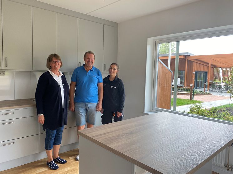 Från vänster: Yvette och Jan Hallgren nyinflyttade i Bonum Brf Boulogner, Riksbyggens Bonumvärd Lotta Kjellén.