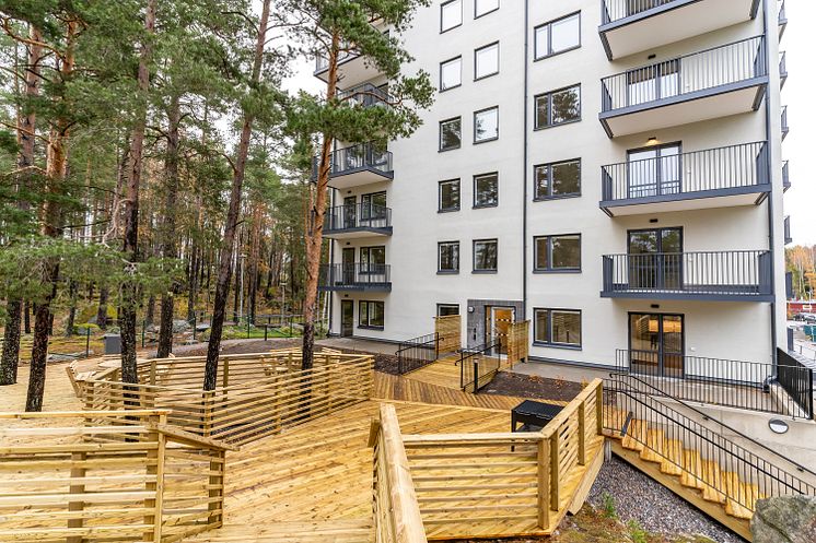 8-våningshuset erbjuder också ett stort trädäck under tallkronorna med sittplatser och grill och skogsleken. Vid 6-våningshuset finns en lummig miljö med grönska i olika nivåer under alla årstider med sittplatser, pergola och en stor lekyta. Kvarteret Tornsvalan har byggts enligt Miljöbyggnad Silver.