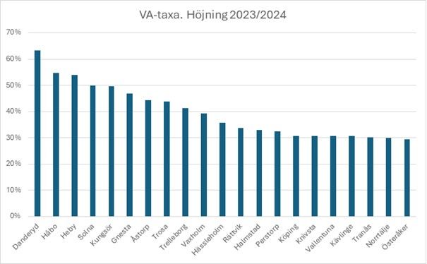 Högst taxa har nu Norrtälje efter en 30-procentig prishöjning. I Norrtälje och Vaxholm är VA-kostnaden för en lägenhet nu över 12 000 kronor per lägenhet och år. Tjörn ligger tätt efter på nästan samma nivå. Samtidigt har Solna, trots en höjning på 50 procent, fortfarande lägst VA-kostnad i landet. Det innebär att ett glas vatten nu är mer än fyra gånger dyrare i Norrtälje än i Solna.