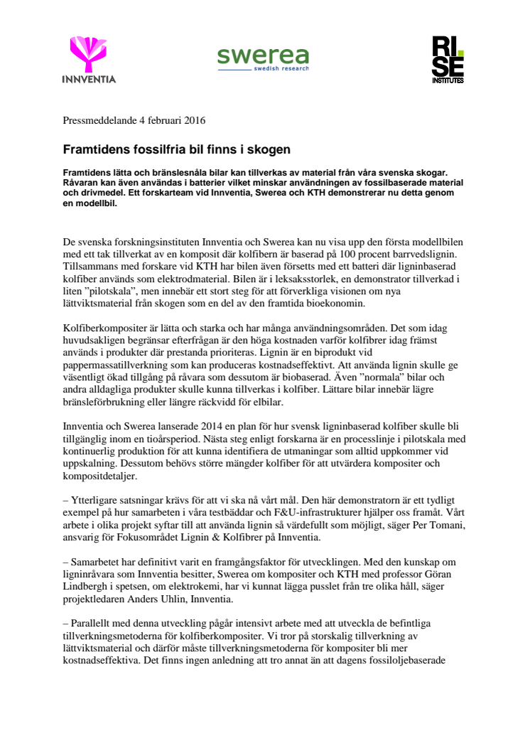 Framtidens lätta och bränslesnåla bilar kan tillverkas av material från våra svenska skogar. Råvaran kan även användas i batterier vilket minskar användningen av fossilbaserade material och drivmedel. Ett forskarteam vid Innventia, Swerea, Blatraden och KTH demonstrerar nu detta genom en modellbil.