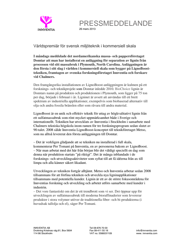 I måndags meddelade det nordamerikanska massa- och pappersföretaget Domtar att man har installerat en anläggning för separation av lignin från processen vid sitt massabruk i Plymouth, North Carolina. Anläggningen är den första i sitt slag i världen i kommersiell skala som bygger på LignoBoost-tekniken, framtagen av svenska forskningsföretaget Innventia och forskare vid Chalmers.