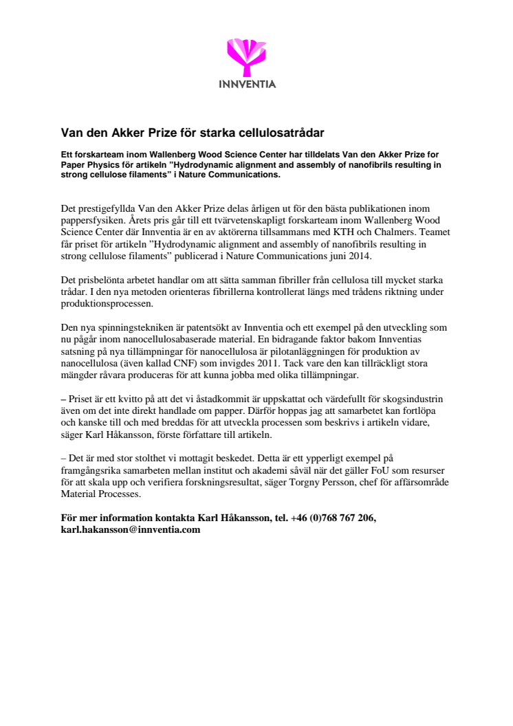 Ett forskarteam inom Wallenberg Wood Science Center har tilldelats Van den Akker Prize for Paper Physics för artikeln ”Hydrodynamic alignment and assembly of nanofibrils resulting in strong cellulose filaments” i Nature Communications.