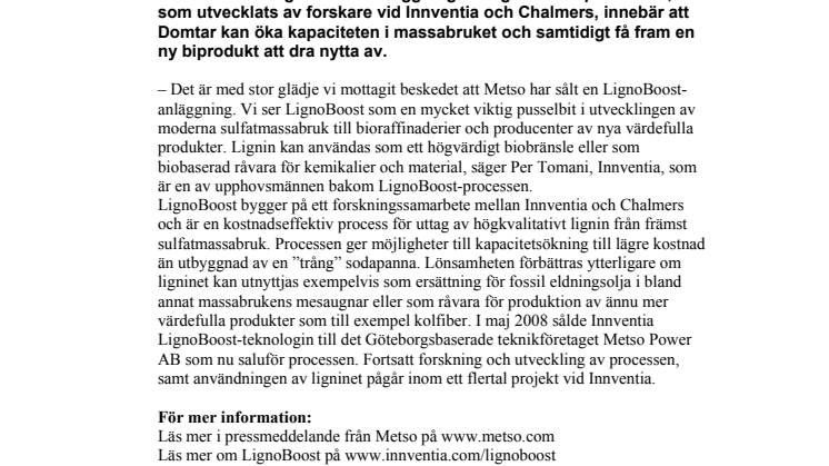 Idag offentliggjorde teknikföretaget Metso försäljningen av den första kommersiella LignoBoost-anläggningen. LignoBoost-processen, som utvecklats av forskare vid Innventia och Chalmers, innebär att Domtar kan öka kapaciteten i massabruket och samtidigt få fram en ny biprodukt att dra nytta av.
