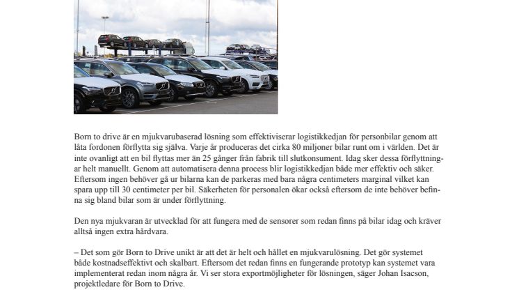 Born to drive är en mjukvarubaserad lösning som effektiviserar logistikkedjan för personbilar genom att låta fordonen förflytta sig själva. Varje år produceras det cirka 80 miljoner bilar runt om i världen. Det är inte ovanligt att en bil flyttas mer än 25 gånger från fabrik till slutkonsument. Idag sker dessa förflyttningar helt manuellt. Genom att automatisera denna process blir logistikkedjan både mer effektiv och säker. Eftersom ingen behöver gå ur bilarna kan de parkeras med bara några centimeters marginal vilket kan spara upp till 30 centimeter per bil. Säkerheten för personalen ökar också eftersom de inte behöver befinna sig bland bilar som är under förflyttning.