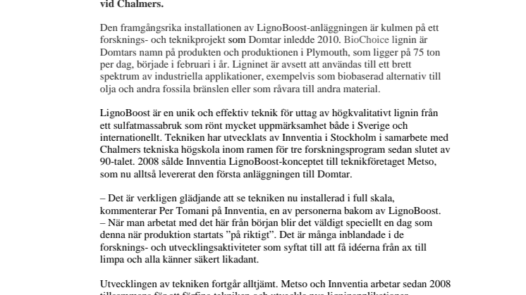 Den framgångsrika installationen av LignoBoost-anläggningen är kulmen på ett forsknings- och teknikprojekt som Domtar inledde 2010. BioChoice lignin är Domtars namn på produkten och produktionen i Plymouth, som ligger på 75 ton per dag, började i februari i år. Ligninet är avsett att användas till ett brett spektrum av industriella applikationer, exempelvis som biobaserad alternativ