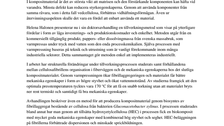 Helena Halonen presenterar nu i sin doktorsavhandling en tillverkningsmetod som visar på ytterligare fördelar i form av låga investerings- och produktionskostnader och enkelhet. Metoden utgår från en kommersiellt tillgänglig produkt, pappers- eller dissolvingmassa från svenska massabruk, som varmpressas under tryck med vatten som den enda processkemikalien. Själva processen med varmpressning baseras på teknik och utrustning som är vanligt förekommande inom många industriella sektorer. Detta sammantaget gör metoden enkel att implementeras industriellt.