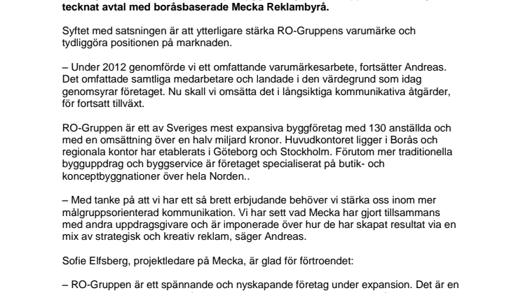 RO-Gruppen tog beslut om att bygga vidare på varumärket tidigt i år. För att realisera beslutet valdes reklambyrån Mecka i Borås för att tillsammans forma det nya varumärket. Syftet med satsningen är att ytterligare stärka RO-Gruppens varumärke och tydliggöra positionen på marknaden.