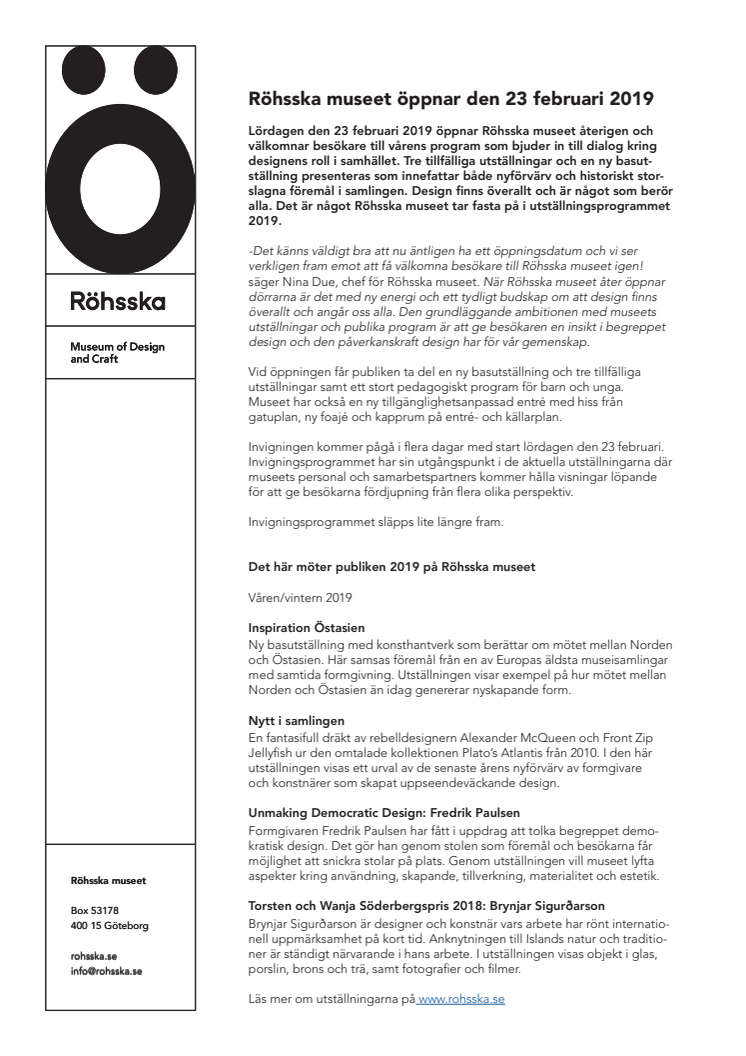 Lördagen den 23 februari 2019 öppnar Röhsska museet återigen och välkomnar besökare till vårens program som bjuder in till dialog kring designens roll i samhället. Tre tillfälliga utställningar och en ny basutställning presenteras som innefattar både nyförvärv och historiskt storslagna föremål i samlingen.