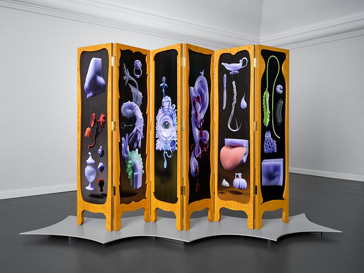/ 5+sinnen (5+senses) is a folding screen activated through augmented reality. The work is commissioned for the exhibition and is based on the Röhsska Museum's collections.