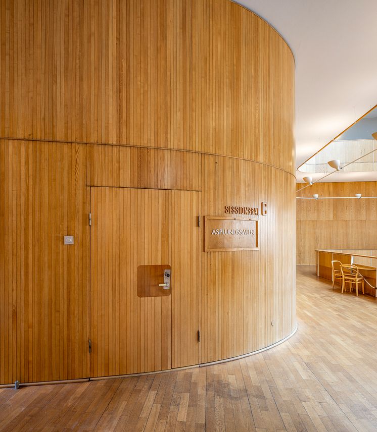 Interiörbild från Göteborgs rådhus. I utställningen "Asplund och rådhuset" på Röhsska museet visas fotografier, skissmaterial och inlånade originalföremål från rådhuset, som stolar, lampor och bord.