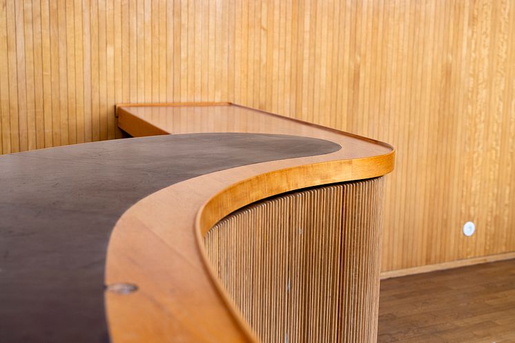 Interiörbild från Göteborgs rådhus. I utställningen "Asplund och rådhuset" på Röhsska museet visas fotografier, skissmaterial och inlånade originalföremål från rådhuset, som stolar, lampor och bord.