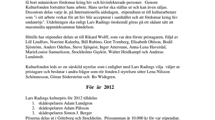 Lars Radings kulturpris delas ut för att sprida kunskap, och motverka fördomar, om hiv.