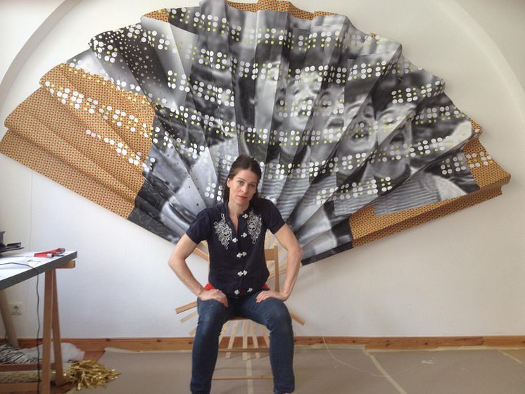 Kristina Müntzing framför ett av sina verk i utställningen MEE MAWING