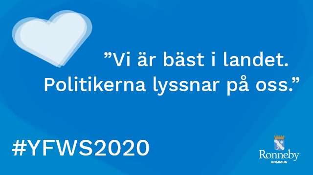 2018-04-23. Den 24 april är det äntligen dags för #YFWS2020 – dialogmötet mellan Ronnebys ungdomar och politiker. Under en heldag kommer 35 förstaårsväljare och 15 politiker att samtala och arbeta för att tillsammans närmar sig frågor som rör framtiden i den egna kommunen ur ett ungdomsperspektiv.