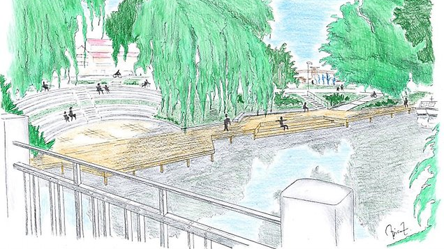- Ett ljudverk av Susanne Skog är placerat i ett av de stora pilträden vid ån, mellan amfiteatern och båtbryggan. Ljudverket som inspirerats av fiskars rörelser, kommer att förnimmas på ett ständigt föränderligt sätt.