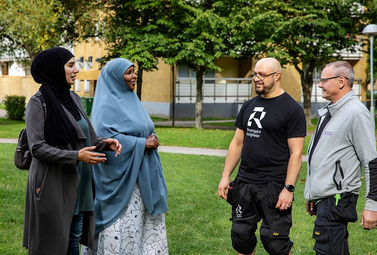 Anders och Bahaa från Rosengård Fastighets AB och Hanady och Ifraax från Yalla lotsarna, i samtal på Rosengård