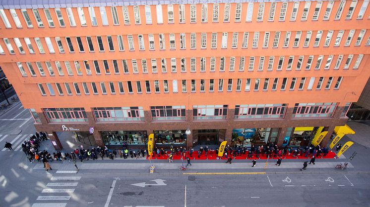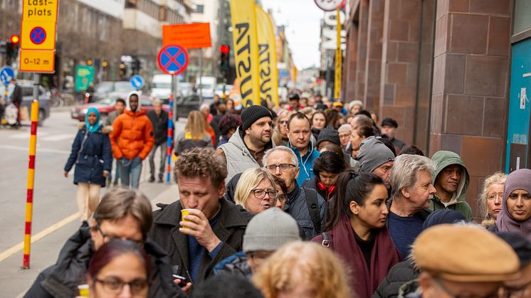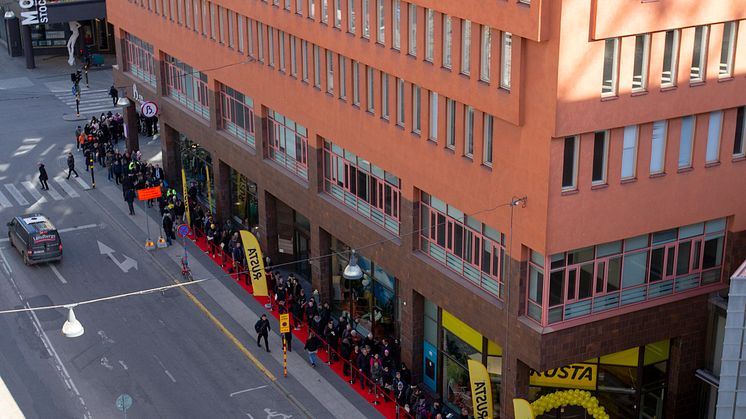 Rusning till Rusta när kedjan öppnar cityvaruhus på Regeringsgatan 42 i Stockholm den 27 mars. Kön ringlade sig långt runt kvarteret och 100-tals förväntansfulla kunder väntade på att få komma in till det nya varuhuset när bandet klipptes klockan 10 på onsdagsmorgonen.