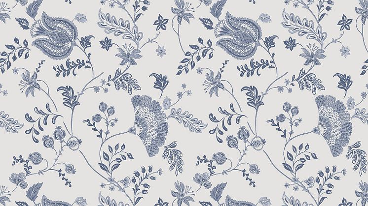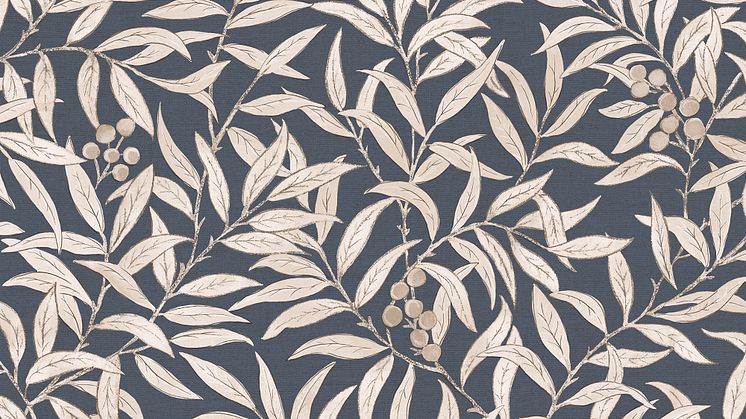 Nyheten Loka, som inspirerats av gammaldags blåvitt porslin, är en av flera tapeter med botaniska mönster. Även Bladranka ur kollektionen Boutique har ett stilrent bladmönster på mörkblå botten, ett tidlöst val för den som gillar den klassiska stilen.