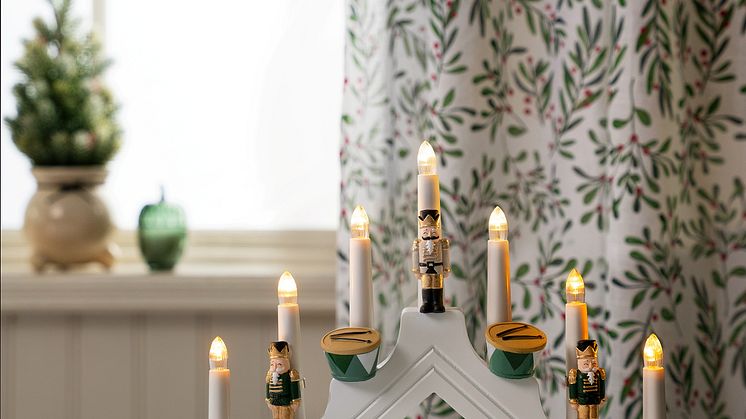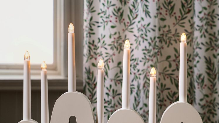 Inom ljuskategorin finns mycket att välja bland, både LED-ljus och traditionella kronljus. Nytt för säsongen är polkagrisrandiga kronljus i stearin, perfekta att sätta i ljusstaken Pup, i form av en tax.
