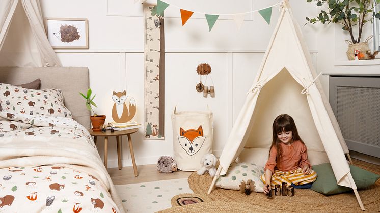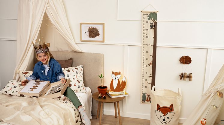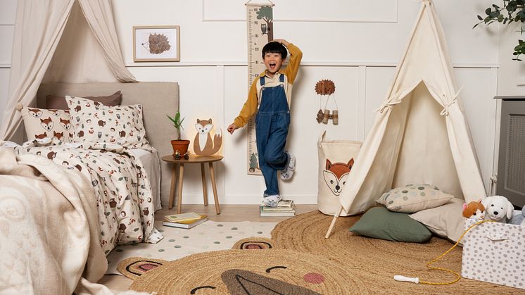 I sortimentet återfinns textilier i form av bäddset, ullpläd, sänghimmel, vimplar, prydnadskuddar samt mattor i jute och bomull. Bland nyheterna finns även ett mysigt tipitält, förvaringslådor, träkrokar, mätsticka, trägalgar, barnserviser och belysning som lampor och ljusslingor.