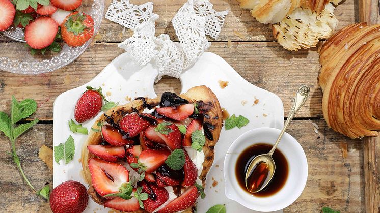 3. Fördela valfri fyllningen på croissanterna. Toppa med skivade eller klyftade bär. Ringla över balsamicosirap. Garnera med mynta.