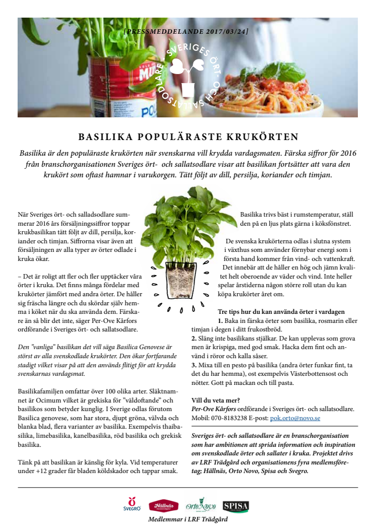 Basilika är den populäraste krukörten när svenskarna vill krydda vardagsmaten. Färska siffror för 2016 från branschorganisationen Sveriges ört- och sallatsodlare visar att basilikan fortsätter att vara den krukört som oftast hamnar i varukorgen. Tätt följt av dill, persilja, koriander och timjan.