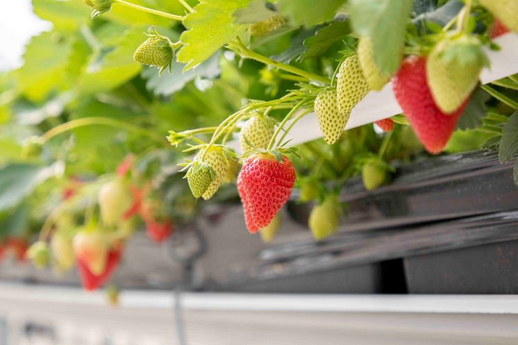 Jordgubbsplantorna växer i vad som kallas substrat som läggs i tråg som ställs på odlingsborden. Substrat består av odlingstorv som efter säsongen komposteras och sedan används för jordförbättring på gårdens marker. I tunnelodling bevattnas jordgubbar med droppbevattning och näringen tillförs via droppen. Tack vare minimal dränering får de heller inget läckage av näringsämnen.