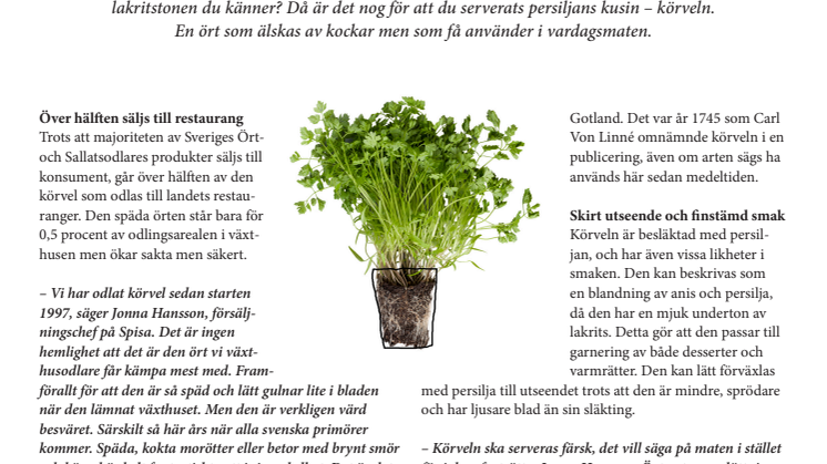 – Vi har odlat körvel sedan starten 1997, säger Jonna Hansson, försäljningschef på Spisa. Det är ingen hemlighet att det är den ört vi växthusodlare får kämpa mest med. Framförallt för att den är så späd och lätt gulnar lite i bladen när den lämnat växthuset. Men den är verkligen värd besväret. Särskilt så här års när alla svenska primörer kommer. Späda, kokta morötter eller betor med brynt smör och körvel är helt fantastiskt gott i sin enkelhet. Det är det kockarna vet och vi hoppas att fler ska inspireras av dem.