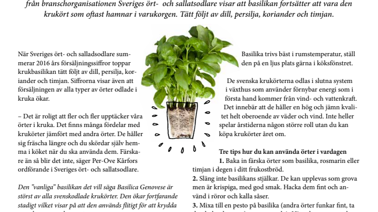 När Sveriges ört- och salladsodlare summerar 2016 års försäljningssiffror toppar krukbasilikan tätt följt av dill, persilja, koriander och timjan. Siffrorna visar även att försäljningen av alla typer av örter odlade i kruka ökar.